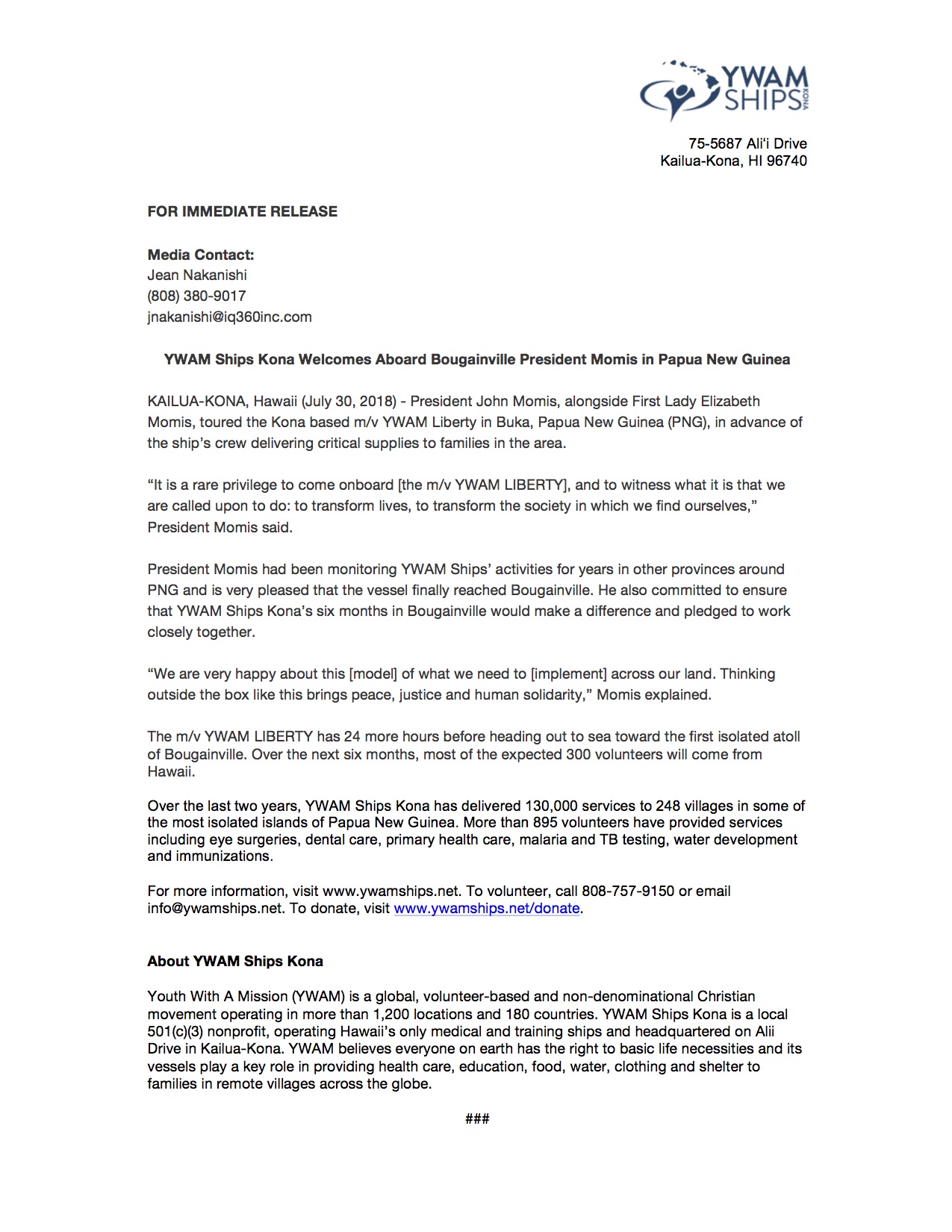 YWAM Ships Kona Press Release July 2018